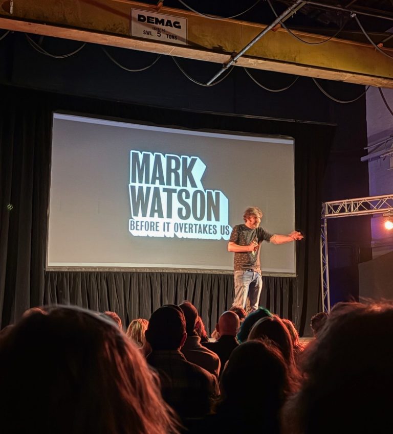 I was slightly haunted by being back Steamworks after having enjoyed myself far too much there at the magical Sheffield Cocktail Festival just a couple of days earlier. I blinked away the memory of margarita number what‑was‑it‑again and took in the transformed space. It’s an ideal set‑up for comedy: spacious, quiet and well laid out. A food van served snacks in the interval, and the bar queues were practically non‑existent. The sound quality was excellent. There was even room for a signing table at the back with copies of Daniel’s Bedtime Stories for Privileged Children (neatly described by The Times as “as if Succession was turned into a series of Ladybird books”).