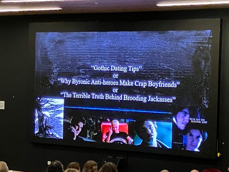 Dr. Maisha Wester was brilliant. Opening the lecture with alternative titles such as “Gothic Dating Tips” and “The Terrible Truth Behind Brooding Jackasses,” the talk began on a humorous high and didn’t falter for the entire two hours. Gothic male writers, she explained, often place blame on a female figure (frequently a mother) while Gothic female writers subtly weave the danger behind an attractive male persona into their narratives.
